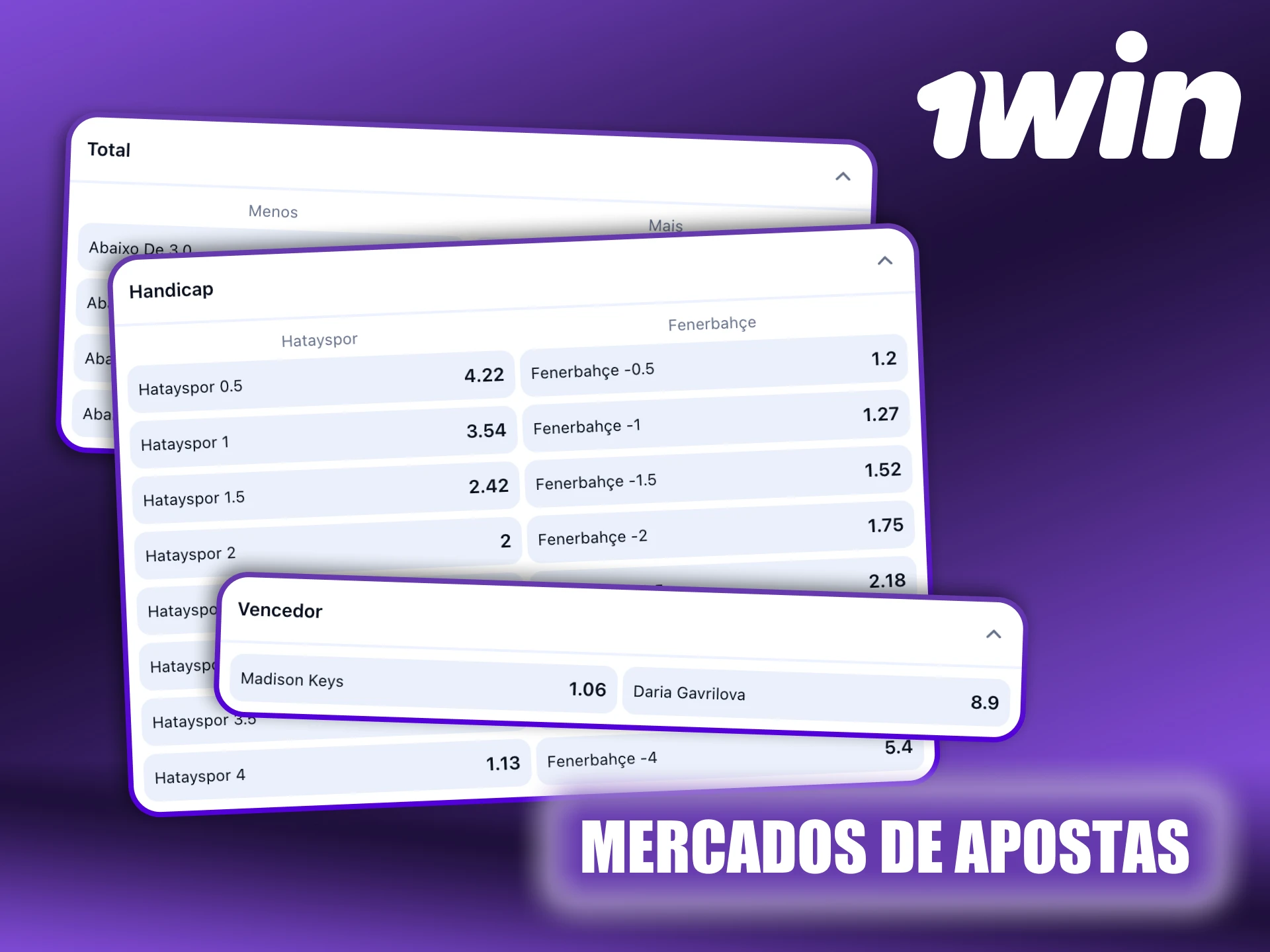 Pode encontrar muitos mercados de apostas no 1Win, dependendo do jogo ou desporto que escolher. Cada mercado dá-lhe uma forma diferente de ganhar: